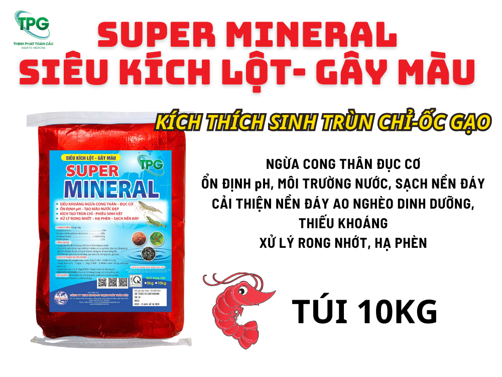 SUPER MINERAL là giải pháp khoáng tổng hợp vượt trội, được thiết kế để cung cấp đầy đủ dưỡng chất cho ao nuôi, giúp tôm phát triển khỏe mạnh, đồng thời cải thiện chất lượng nước, tạo môi trường lý tưởng cho sự tăng trưởng.